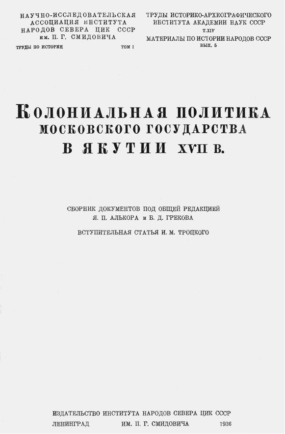 /Колониальная политика Московского государства в Якутии XVII в. Сборник документов под общей редакцией Я. П. Алькора, Б. Д. Грекова. Вступительная статья И. М. Троцкого. Ленинград. (1935) 1936. С. ХХ-ХХІ./
