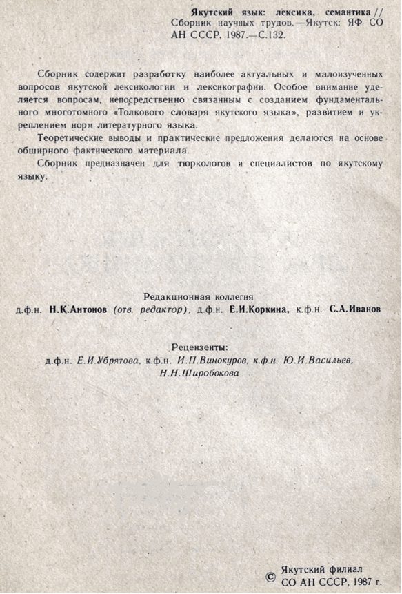 ...Вариантность широко представлена в якутском разговорном языке. В одном только «Словаре якутского языка» Э. К. Пекарского насчитывается свыше 6500 вариантных слов [13], которые, по нашим расчетам, дают свыше десяти тысяч вариантов. В данном случае речь идет о вариантах слова в собственном, узком смысле, как регулярно воспроизводимых изменениях одного и того же слова, характеризующихся тождественной лексико-семантической функцией и частичным различием звукового состава... В дальнейшем рассматриваются именно варианты в пределах тождества слова и в основном те из них, которые распространены почти повсеместно, широко употребляются (в том числе в письменной литературе).